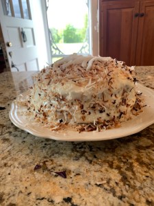 When I had a three hour break on Sunday, when everyone was off doing their own thing, I decided to tackle this recipe that I got off Facebook, on the Southern Living site. I will provide the link below. It is not something that you’re just going to throw together and into the oven, so make sure you have a chunk of time set aside to make this. It involves making the cake batter, making the pineapple reduction on the stove for the filling, making the frosting from scratch, and then cutting the two cakes into four and filling and stacking and then frosting. It is definitely worth the effort, but also time consuming. My son in law Tyler, who is not a cake fan, said it was better than any pie he’d ever tasted (he loves pie)! Quite the compliment. And my husband has asked me to make it again for his birthday, next month, and Father’s Day, next month, and our Anniversary, next month. That’s how good it was!