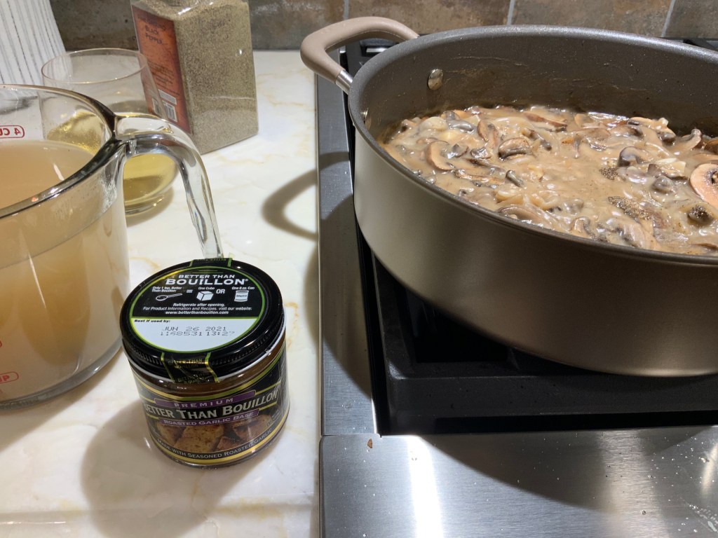 So, I watched the Allrecipes video, and then got out all the ingredients plus a few extras. I browned the pork chops, set them aside and then sautéed the onion, mushrooms, and garlic together. I mixed up some flour (bread flour because it was a choice between that and whole wheat flour and I wasn’t sure which would taste better, or rather worse) along with some white wine and water and Roasted Garlic Better than Bouillon. I added this directly to the sautéed veggies, and cook on medium until bubbly and thickened. I have to say I really, really liked the flavor that the Garlic bouillon added. I usually use Beef or Chicken Better than Bouillon but saw this new flavor and picked it up when shopping last time.